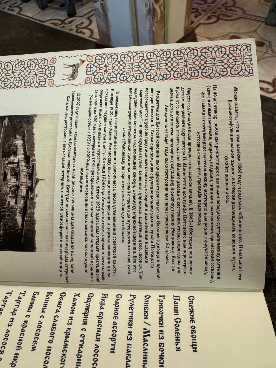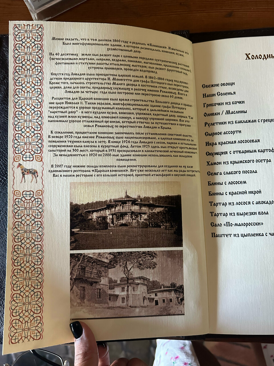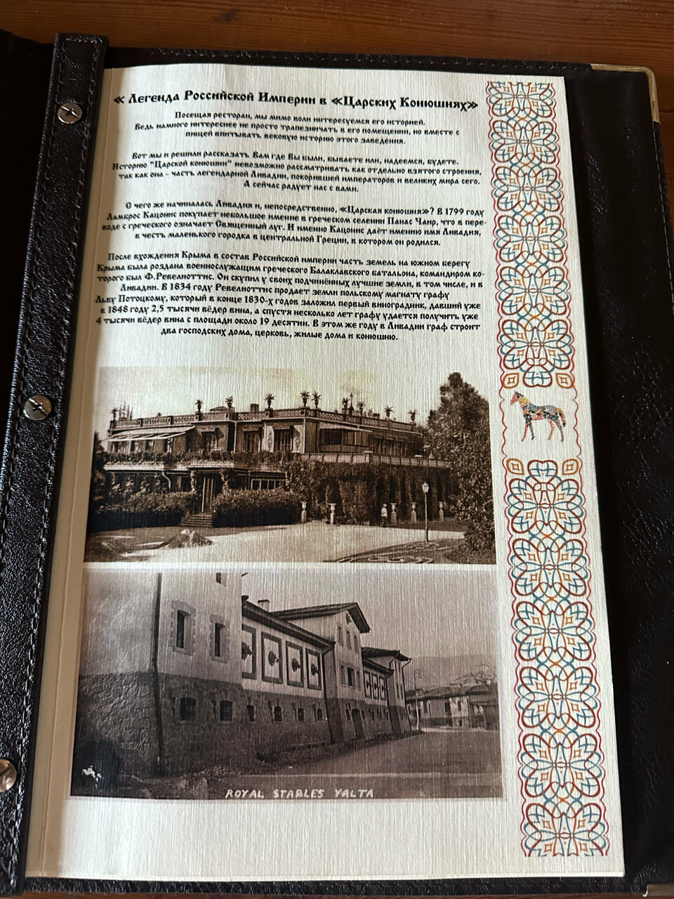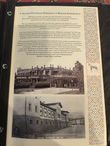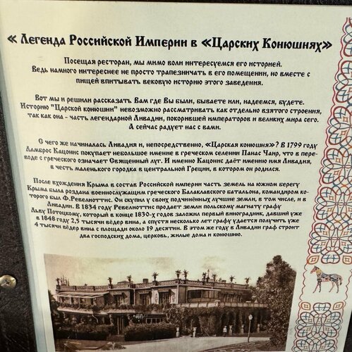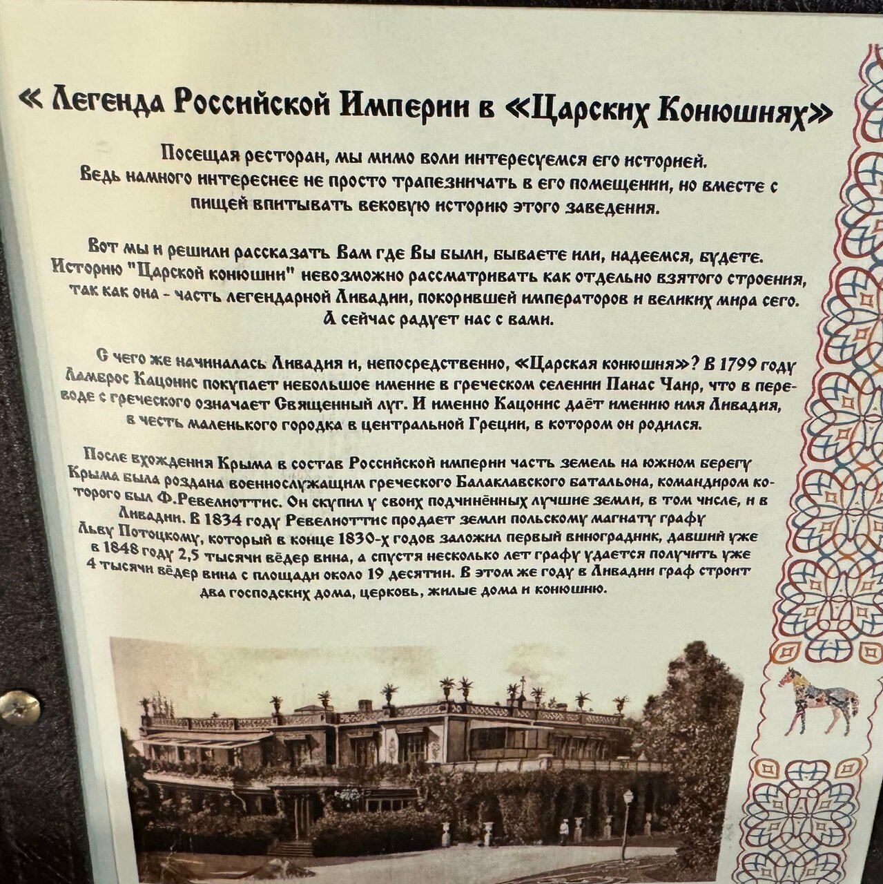 Дополняю через 5.5 лет. Ехали в Ливадийский дворец, но прежде всего ради Царской конюшни. Еда стала ещё вкуснее. И не так и дорого. Большое спасибо ресторану!